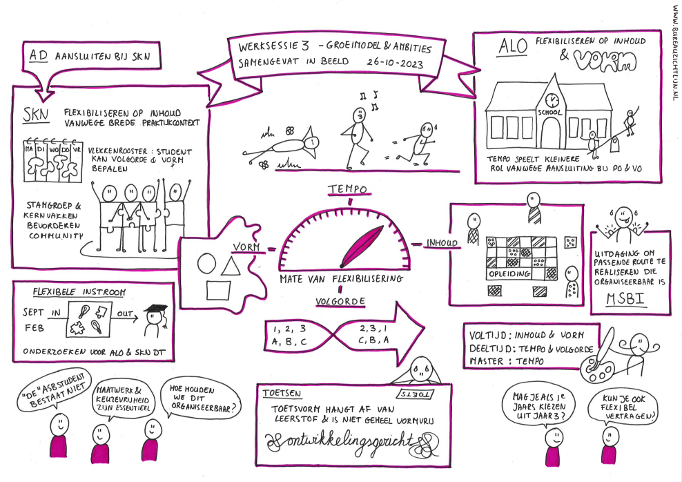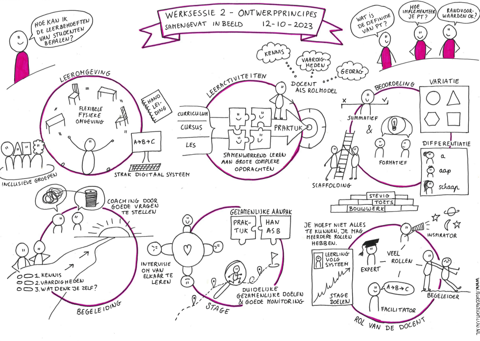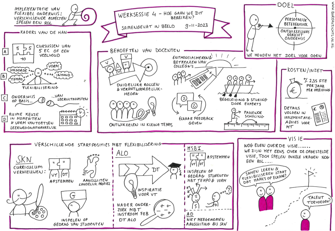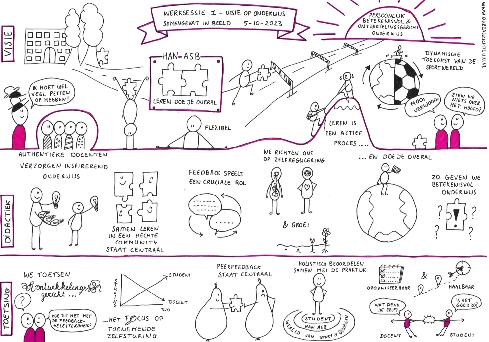Bij de Academie HAN Sport en Bewegen zijn we bezig met het vernieuwen van het curriculum. Tijdens de eerste fase hebben we samen met een groep collega’s bepaald wat onze visie is op onderwijs. Elze heeft dit proces kernachtig en visueel weergeven in vier praatplaten. Dit helpt ons om alle collega’s mee te nemen afwegingen die zijn gemaakt en discussies die zijn gevoerd. De platen nodigen uit om bij het koffiezetapparaat het er nog is over te hebben. Elze is erg kundig in het scheiden van hoofd- en bijzaken en de essentie in een tekening weer te geven. Haar gevoel voor humor en kennis over organisatieprocessen is terug te zien in haar tekeningen. Tijdens het schetsen hebben we regelmatig contact gehad, dat werkte erg prettig.